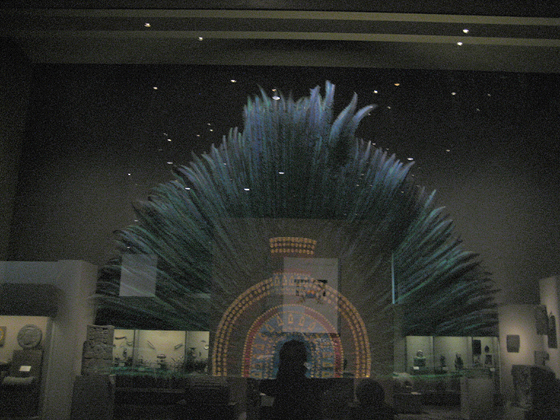 Comments: This photo was taken through a glass covering. In the photo you see reflections of the display cases behind the photographer and opposite this display case. The case features a replica of Moctezuma II's extraordinary headdress. The original is in a museum in Italy. The main feathers are those of the sacred quetzal bird. Years ago it was possible to see this magnificent headdress in this MNA museum without it being shielded behind glass. Online you can see a better (and copyrighted) photo at this site: FlickrFromYahoo. What amazing and glorious colors! How imposing, how impressive, how artistic it is! How grandly symbolic of sacredness and state power it is! Imagine what Hernán Cortés, in his dull steel helmet, thought and felt when he saw Moctezuma II wearing it! For Dr. Little's photo of the same headdress taken before it was protected under glass, go to: => Aztec Art 10a.