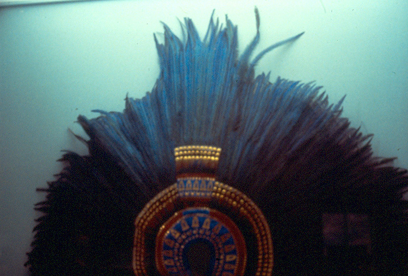Comments: This is a digitized image of an analog photograph of the same replica of the headdress of Moctezuma II's, but it was taken before the headdress was placed behind a glass covering, as it is displayed nowadays. Now you can see the elegance and the colors better.