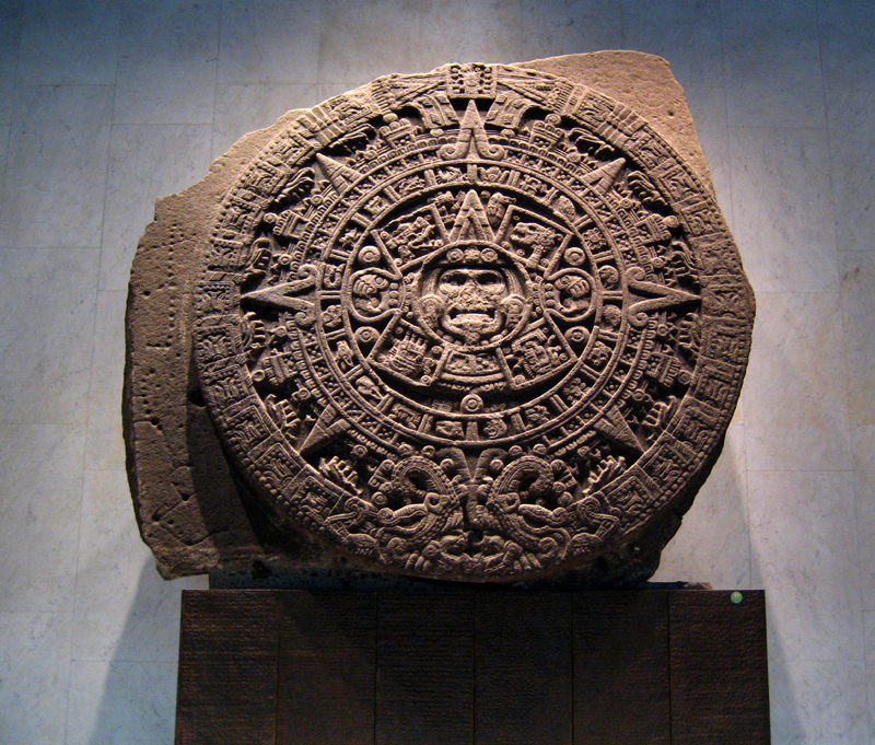 Notes: This giant carved and decorated stone disk measures 3.6 m across and it weighs between 22,000 and 24,000 k. This is a sun monument, not precisely a calendar, but it does contain elements of the Aztec calendar in it. Most scholars believe that originally it was displayed horizontally, not vertically as it is exhibited in a most prominent place in MNA's Sala Azteca. In the center is the sun god, Tonatiuh, whose tongue is sticking out (a symbol of obsidian knives used for sun sacrifices). He is seen with jade ornaments and evenly combed (golden?) hair shown symetrically on each side of his face. Originally, it was painted gold and red over exposed stone. Tonatiuh represents the Fifth Sun. In the surrounding circle we see four square boxes, one for each of the previous Suns. Continuing out from the center, beyond the circle with the four suns, the next and larger circle shows symbols for the 20 days of each Aztec month. The next ring is edged with four large A shapes with curling feet: these pointed shapes represent the four cardinal points. The top A shape is to be oriented toward the east, indicating the rising sun; the bottom A shape is oriented west, representing the feminine principal that leads to the setting sun and descent into the death and the underworld. In the next circle, which intersects with the four larger A-shaped cardinal points, are stones, feathers and elements related to sacrifices. The last circle at the outer ring depicts two Fire Serpents (Xiuhcóatl) below a glyph (symbol) for 13-Cane, the day date when the Sun Stone was inaugurated. The two serpents' heads are shown at the bottom with open jaws. In each open mouth is a head, presumably that of a sacrificed head: this represents the battles of life and death during the night and in the underworld.
