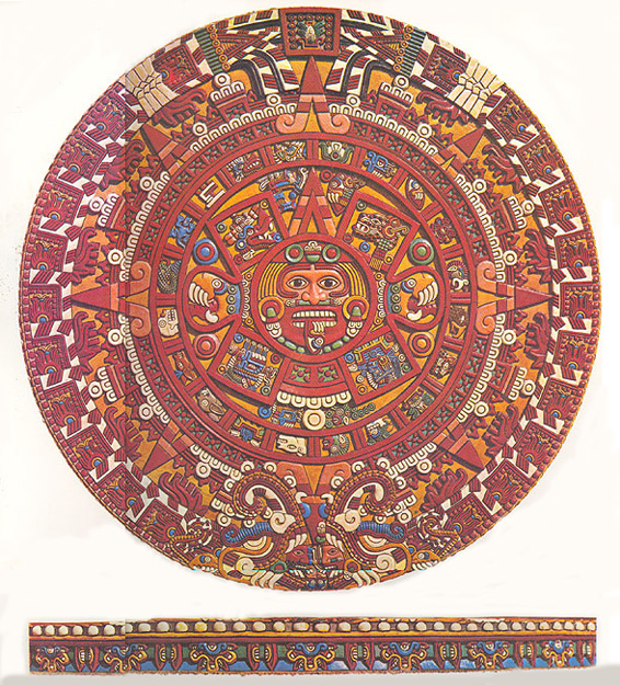 Image: This is an artist's depiction of the Sun Stone as it may have appeared in full color upon its unveiling at the Templo Mayor (Great Pyramid) in Tenochtitlán in 1479.