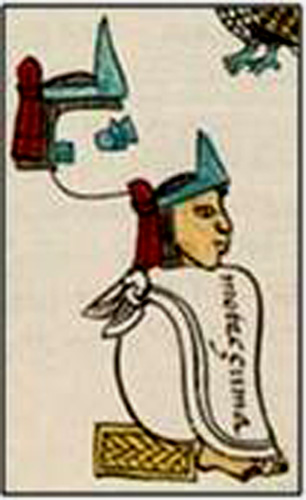 Comments: On the left is a twentieth-century painting of Montezuma that uses elements from the historical record to imagine a realistic but also romanticized representation of this next-to-last emperor of the Aztecs. On the right is an image from the fifteen-century Codex Florentino that depicts "Motecçuma" (see the Spanish writing on the figure's front): Note the drawing's fusion of Spanish culture with Aztec/Náhuatl drawing style.