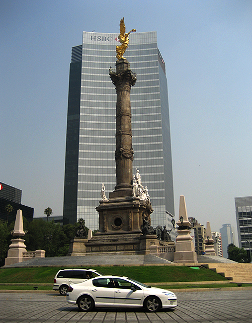 Notes: We shall begin our walk to the MNA on the twelve km-long Paseo de la Reforma, which is Mexico City's version of Paris's Champs-Élysées or New York City's Park Avenue or 5th Avenue. Set against the backdrop of a major bank skyscraper (HSBC) on the Paseo de la Reforma, here you see a monument called "El Ángel" (the angel). Notable in Mexico City's prosperous neighborhoods like those that border the Paseo de la Reforma (especially the still up-scale Zona Rosa), are public squares, traffic circles, major architecture, monuments, and statues. Among those that are found along this major boulevard are monuments to the Aztec hero Cuauhtémoc and Columbus and the fountain of the Greek goddess Diana. The column you see here is the Columna de la Independencia (Independence Column). It is crowned with a golden statue of the Winged Victory. However, the statue is commonly called "El Ángel". It was erected by Antonio Rivas Mercado in 1910, and it commemorates the war of independence against Spain (1810-1821). Monuments and statues are a standard feature of Latin American humanities.