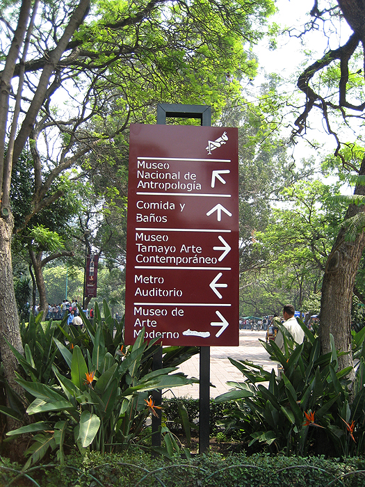 Notes: Just inside the Chapultepec park on the Paseo de la Reforma, we see a sign that points the way to the MNA along with other major cultural attractions including the Tamayo Art Museum (Rufino Tamayo, 1899-1991) and Modern Art Museum. We shall take the path that angles obliquely ahead to the left.