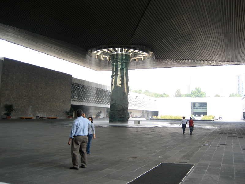 Notes: After passing through the entrance hall (40 pesos; Tuesday through Sunday 9:00 - 19.00), we enter the huge central patio, seen here. In the wings to the right, center, and left from where the photographer-professor is standing (the photographer you see is another tourist), separate rooms are dedicated to art from major pre-Columbian civilizations: Maya, Teotihuacan, Toltec, Aztec, Oaxaca, Gulf Coast, northern Mexico, and western Mexico. In the center of this patio you see a sculpted pillar 36 ft high (11 m). The pillar is supporting a canopy 275 ft long (84 m), and it is covered with bas relief sculptures of ancient European and Mexican civilizations. Furthermore, the pillar is the central piece in an open fountain where the water falls in a circle around the pillar onto the patio floor below.