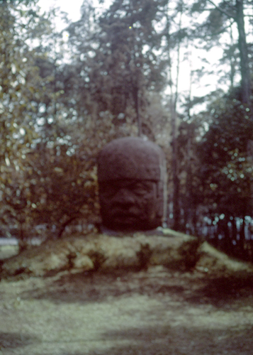 This is a closeup photo of an Olmeca stone head which WTL took ten years ago inside the MNAM. Notice the stylized features of this helmeted Olmeca male. | This (bad) photo was taken by WTL many years ago outside the main buildings of the MNAM. It shows the relative size of the large stone sculptures of Olmeca heads. |
