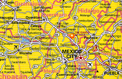 This portion of the map of México (from my Frommer's map) shows the region of SFCC's Mexico trip in 2008: Mexico City, Guanajuato (upper left), San Miguel de Allende (upper left central), Querétaro (below San Miguel de Allende). It also shows Teotihuacan just north of Mexico City. And just north of Teotihuacan you see what this map calls "The Giants of Tula", 75 km north of Mexico City. |