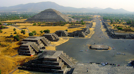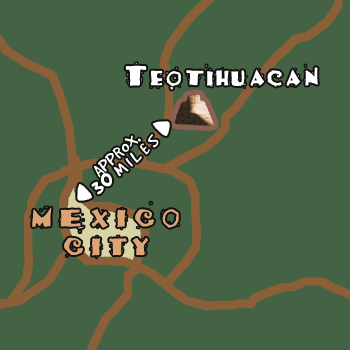 Following the Olmecs, the next major civilization of the pre-Columbian era that we shall take a brief notice of is Teotihuacan (pronounced either with stress on the last syllable, as in Teoitihuacán (traditional) or next-to-last syllable, as in Teotihuacan (contemporary or indigenous pronunciation). As you can see on the image above, the archeological zone of Teotihuacan is about 30 miles north of Mexico City. It is found in the Valle de Teotihuacan, which measures about 9 miles by 4 miles. In the center was a large city covering about one mile square. Apparently, the teotihuacanos originated at Cuicuilco on the south side of Lake Texcoco (south Mexico City and just south of the Valle de Anáhuac, the center of which is where Mexico City is situated). The people of Cuicuilco worshipped the fire god Huehuetéotl in the volcanic peak of Xitla, which was southwest of Cuicuilco. When Xilta erupted lava flowed first north to Lake Texcoco, and then it circled back south to Cuicuilco, where it encircled the pyramid dedicated to Huehuetéotl. The Cuicuilco people abandonded the site and migrated north to the Valley of Teotihuacan, which is at the extreme north end of the central valley of Anáhuac.