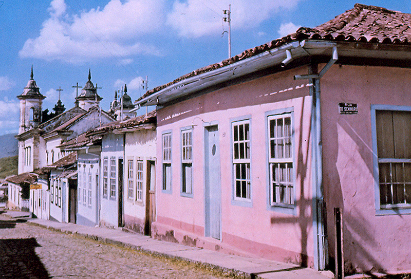 : Here you see one of the old colonial streets in Ouro Preto on the corner of the Rua do Semanário (Semenary Street). The color of the buildings is very typical of homes throughout Brazil.