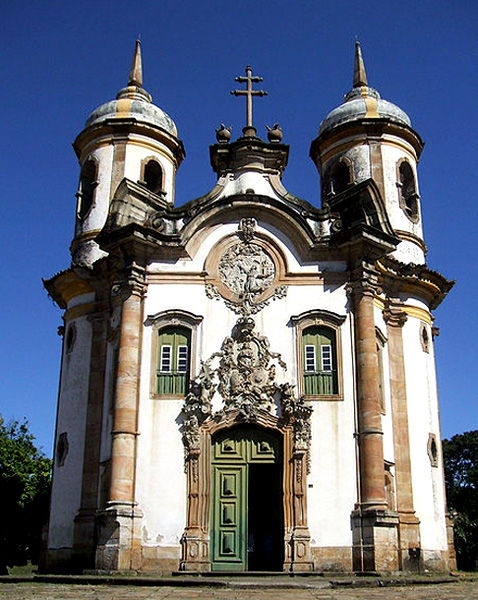 Image: Church of São Francisco de Assis in Ouro Preto Comments: Here you see the stairway with eight of the twelve statues of Old Testament prophets. This building is considered Aleijadinho's masterpiece because of it Neoclassical design, its balance, harmony, simplicity, economy of elements, and beauty. |