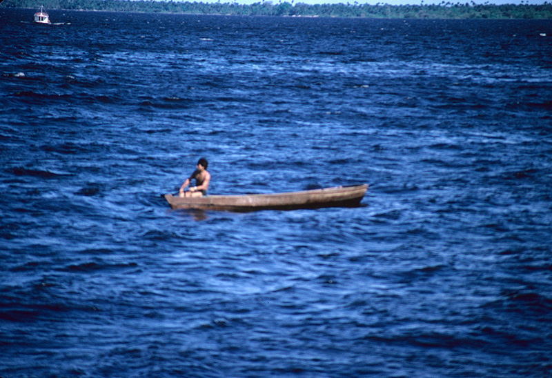 Comments: This is a view of a man in a dugout canoe on the Rio Negro. Notice that this image links with some of the photographs we studied in the Opening Slide Show; see, notably: => Opening Show #15. For a picture of a boat that is one level up in terms of motorized power, see: => Amazon #3a. For an important discussion of pre-contact Amazonia (i.e., before these Europeans "discovered" the Amazon and before they explored it: Amerigo Vespucci and Vicente Pinzón in 1499 and Francisco de Orellana in 1542), see Charles C. Mann's book, 1491, pp. 315-349. Among many important statements he makes in his book, he mentions that contemporary scholars believe that Amazonia was once a densely populated and highly cultivated region. Referring to the Tapajós river region about half way down the Amazon from Manaus, Mann says this: