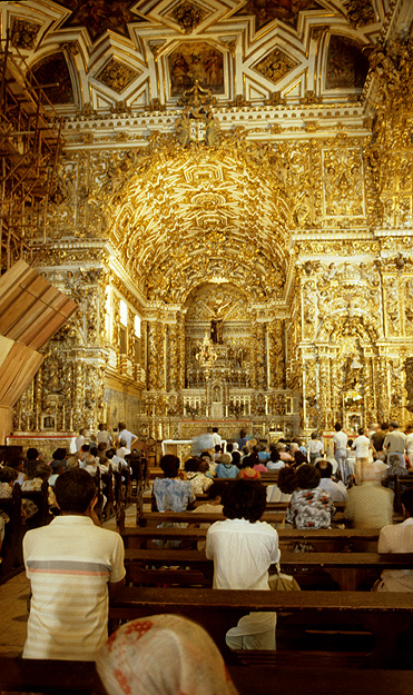 Source: WTL photograph© on site in Bahia. Comments: Here we see the extraordinary gold leaf-incrusted interior of the Igreja de São Francisco (Church of St. Francis), which was built in the 18th century. This church's exterior (not pictured) is in the Neoclassical style with stone imported from Portugal, but the interior is typical of the late Baroque (Rococco) with its elegant use of ornate and sumptuous horror vacui. |