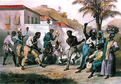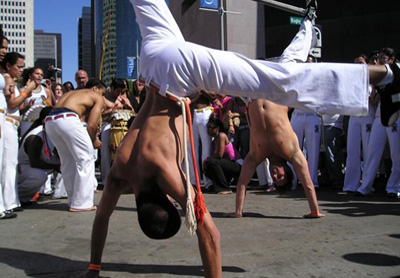 Comment: Capoeira is a martial art that combines foot fighting, music, dance, and traditional African and Brazilian cultures. For this reason, capoeira is a significant aspect of Brazilian (and Latin American) humanities. This art grew out of black slaves' lives, when they were forbidden by their masters to fight; so the slaves concealed this practice in the guise of a gymnastic kind of dance. The image on the left is an 1825 painting,"Capoeira or the Dance of War" by Johann Moritz Rugendas (1802 - 1858). The image on the right is from <houston.metblogs.com>; it shows a scene of Brazilian capoeira dancers.