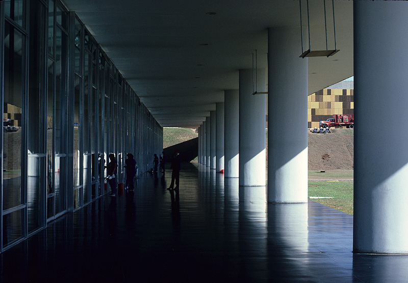 : Here is a view of the outside of the ground floor of the Congresso Nacional.
