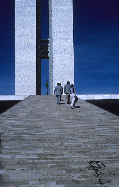 Source: WTL photograph© on site in Brasília. Comment: The Congresso Nacional (National Congress buildings). To take a brief virtual walk on the roof you see ahead to the right and left of the four people who are walking up this ramp preparing to enter the Congresso Nacional buildings, see: => Brasilia #8a. Between the two towers in this photo is a giant flagpole (in this photo it is dwarfed by the buildings) flying the national flag of Brazil. |
