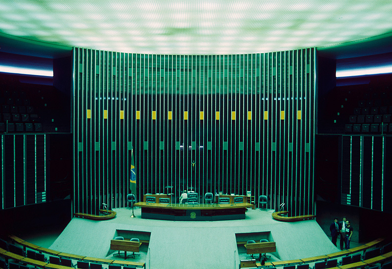 Source: WTL photograph© on site in Brasília. Comment: As you see in this photo, the main hall of the Brazilian Chamber of Deputies is built in a very modern style. Brazil is a federal republic. It's official name is República Federativa do Brasil. The executive branch is headed by the chief of state, who serves a four-year term. The current president (2015) is Dilma Roussef. Brazil has a judicial branch and a bicameral legislative branch in the Congresso Nacional. The Senado Federal has 81 seats, three from each of Brazil's 27 states. The Câmara dos Diputados has 513 seats distributed by proportional representation. The Brazilian currency is the Brazilian real. For other views of this hall, see: => Brasília #9a. |