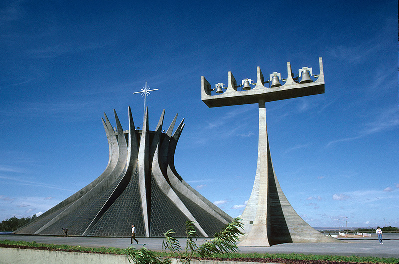 Source: WTL photograph© on site in Brasília. Comment: This building is the Catedral Metropolitana da Nossa Senhora Aparecida (1970). Designed by Óscar Niemeyer (born 1907), it is a concrete-framed hyperboloid structure, which is achieved by revolving a hyperbola around the structure's semi-minor axis. As you will see when we go inside, between each of the concrete ribs is the glass roof that seems to be reaching up to the sky (or, heaven). The Cathedral is circular and has 70 meters in diameter. The hyperboloid structure has 16 identically assembled concrete columns. Note that the architectural style is quintessentially modern. |
