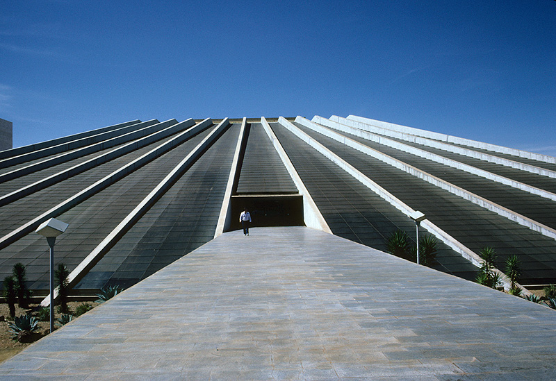 Source: WTL photograph© on site in Brasília. Comment: The main entrance to Brasília's Catedral Metropolitana. This photograph illustrates one of the main features of modern architecture: the architecture calls attention to itself, whereas the entrance of humans who visit or use the building is deemphasized. Compare this church entrance, for example, to the entrance to the convent in which Sor Juana was a nun in Mexico City: => Convento de Sor Juana #8. For a brief virtual tour inside this cathedral, see: => Brasília #14a. |