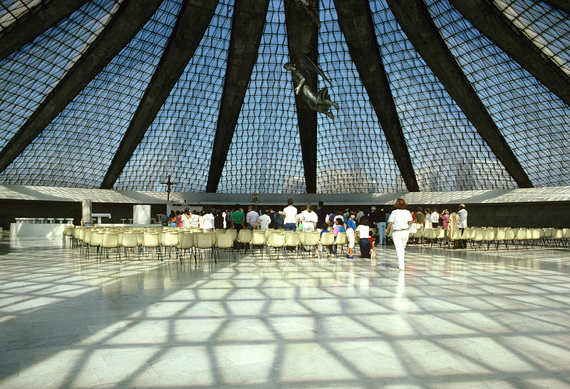 Source: WTL photograph© on site in Brasília. Comment: Here you see that the cathedral's roof is composed of cement ribs and myriad glass panes that give a 360 degree view of the sky, suggestive perhaps of "the firmament of heaven". Suspended from the ceiling's apex is a statue of an angel. |