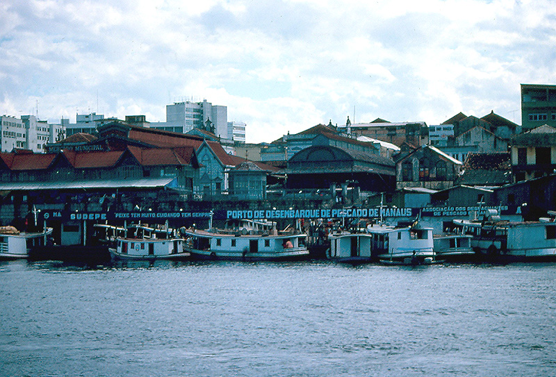 Source: WTL photograph© on site in Manaus. Comment: This is a view of the fishing port of Manaus (o porto de desembarque de pescado de Manaus). In part Manaus is quite atypical of the Brazilian interior because it ignores the surrounding forest while thriving on federal subsities, its status as a duty-free city, and a new increase in tourism. In the early 20th century, Manaus was known as a Art Nouveau center; in the late 20th century it thrived on cheap electronics; but now Manaus is engaged in an ambitious renovation program with an eye on its architectural and cultural centers. Map of Manaus region: To locate Manaus in South American geography, see: => Manaus 1a. For some basic information on the exploitation of rubber as the source of Manaus's prosperity, see: => Amazon #9. |
