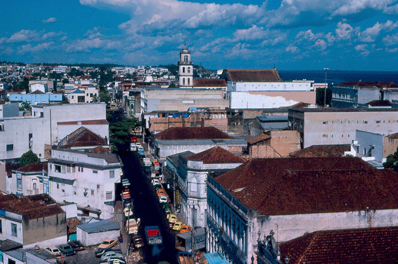 Comment: This is a view to the east overlooking Manaus in the afternoon. Manaus is on the Rio Negro, which you can see to the upper right. In 1669 the Portuguese built a defensive fort here named São José da Barra to protect the Portuguese empire from Spanish raids along the Amazon River. By 1832, the fort had grown to a town, and the name was changed to Manaus, from the local indigenous tribe called the Manaós, who, by the 19th century had disappeared. After 1920, synthetic rubber replaced natural rubber from the Amazon, and the resultant drop in price ruined Manaus. Until the late 20th century.