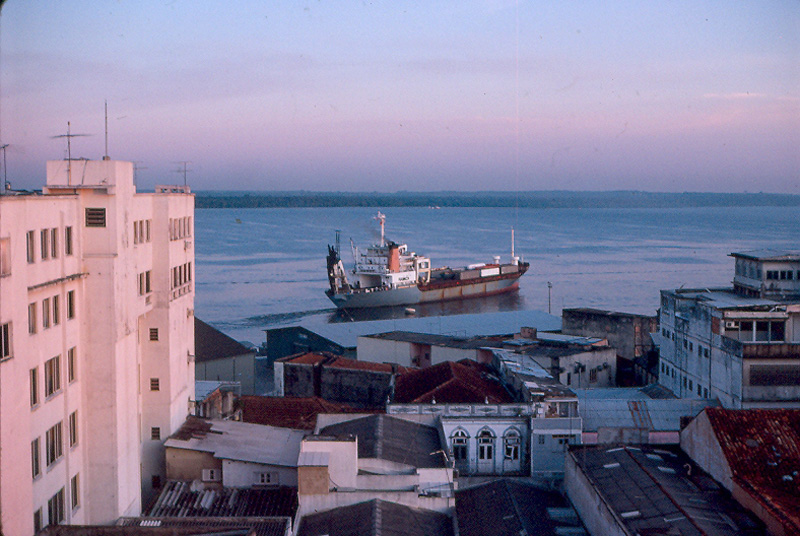 Comment: As the sun is setting we look out to a cargo ship leaving the Manaus port for a trip up-river.