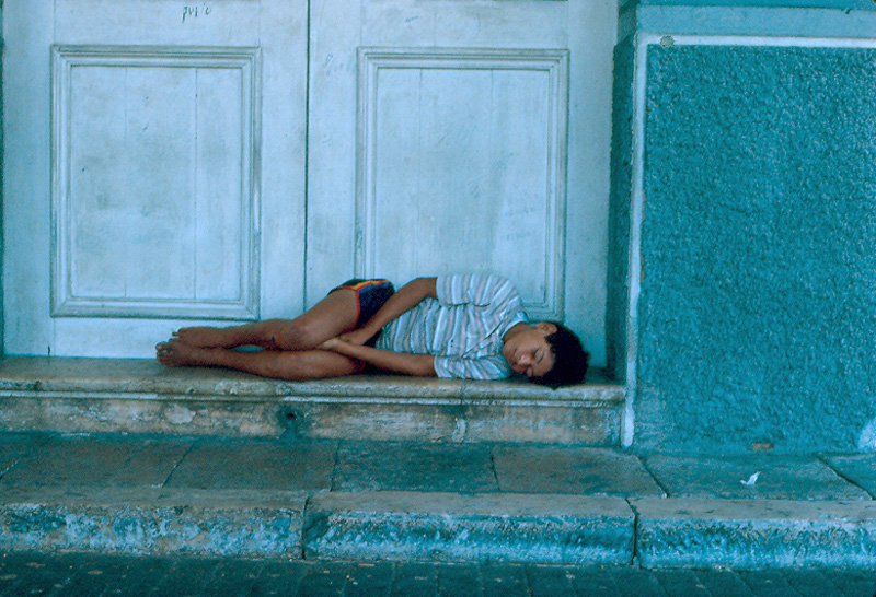 Comment: Exterior of the opera house. This covered driveway leads to a porte cochère (coach door). Here you see a homeless boy sleeping in the opera house's shade on a hot tropical day. For additional views of the interior and exterior of this building, see: => Manaus #13d, and #13e.