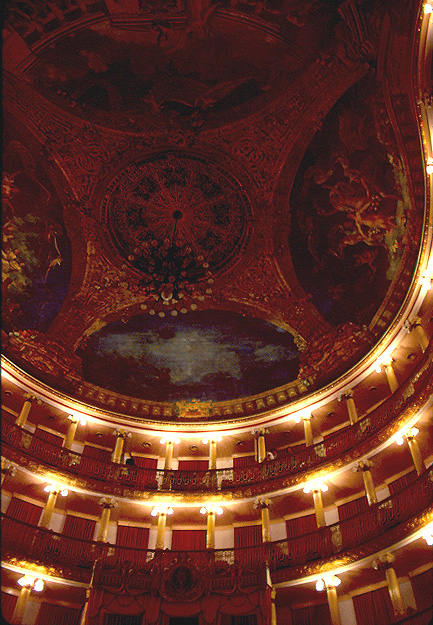 Comment: Interior of the opera house. Here you see the theater's Belle Époque domed ceiling and the upper floors of the auditorium. For additional views of the interior and exterior of this building, see: => Manaus #13e.