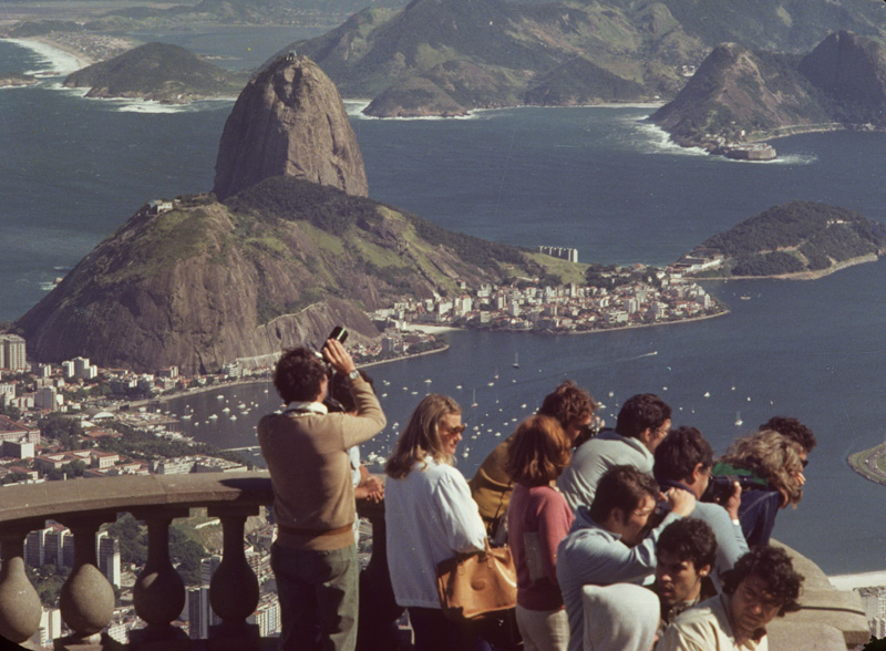 Source: WTL photograph© on site in Rio de Janeiro. Comment: This is a view looking down from Corcovado (Hunchback Mountain, 2,330 feet high), where the large statue of Cristo Redentor (Christ the Redeemer) is located far above the city. The monolith peak on the left is the equally famous Pão de Açúcar (Sugar Loaf, 1,300 feet high) on Guanabara Bay. |
