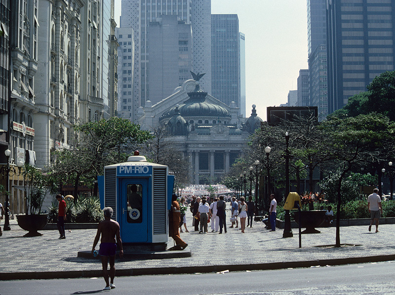 Source: WTL photograph© on site in Rio de Janeiro. Comment: This is a view of the core of Rio's city center. The grand tradition building in the center of this photograph is the Teatro Municipal. It is a replica of the old opera house in Paris. This Teatro Municipal in Rio was built in 1905. Remember that a city needs a very powerful and prosperous financial infrastructure in order to sustain a major opera house, and Rio's is a major opera house. (The professor-photographer saw Puccini's Tosca performed there.) |