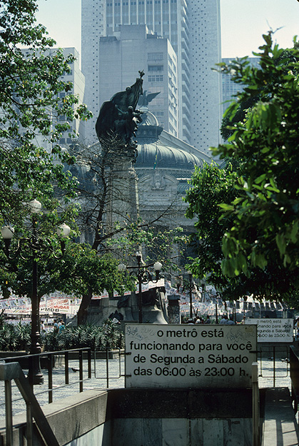 Comment: This is a close-up of the previous photograph from a slightly different angle. In the foreground you see the entrance to Rio's subway (o Metrô Rio). The sign says that the subway "is working for you from Monday through Saturday rom 6:00 a.m. to 11:00 p.m. The system is most useful from Copacabana to downtown. During Carnaval the subway runs 24/7. The cars are air-conditioned, clean, comfortable, and they move quickly. Cars also have Portuguese-English signs, maps, and loudspeaker. (But remember, like all subway systems in the world, even the best ones, one should be very careful when traveling late at night and through certain neighborhoods.)