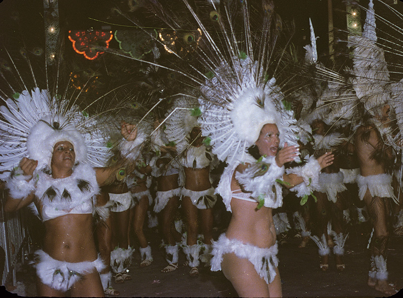 Source: WTL photograph© on site in Rio de Janeiro. Comment: This is a view of Carnival (Portuguese: Carnaval), often called "the biggest party on Earth". The term itself comes from Latin carnem levare (to put away meat), referring to the last day before the old Catholic tradition of refraining from eating meat during the 40 days of Lent (the season before Holy Week and Easter). In the 19th century European masked Carnival balls became popular in Brazil, especially in Rio. By 1932, there were more than 100 high society masked balls throughout the city. During the early years, bands composed of working class musicians were hired to play for these balls, and their music became the basis for modern samba. Various samba clubs then created parades in front of distinguished members of the upper classes. Nowadays, Carnival has three features: street events, club masked balls, and the samba parade. A current feature is also the welcome extended by Rio to the gay community. The most African aspect of Carnival is found in the samba parade The word "samba" itself comes from Angolan, which referred to a ceremony in which men danced with women partners. In Rio, the government supports the parade and awards the prizes for various categories of costumes, floats, and dancers, etc. Embedded photo series, see: => Rio #36a; Rio #3b; Rio #36c; Rio #36d; Rio #36e. Humanities themes: Afro-Latin syncretism; hybridity; carnival (carnaval). |
