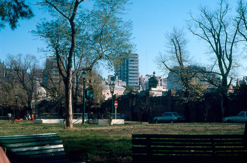Source: See Buenos Aires Index. Image: The park outside the famous Cementerio de la Recoleta in the upscale Recoleta neighborhood. This is one of the world's most famous cemeteries. It houses the crypts of many of Argentina's most notable people. Comments: In the next couple of images we will visit the cemetery looking for perhaps the most famous of these astounding crypts. General question: Does this photo communicate the feeling of tranquility one might expect to found in and surrounding a major urban cemetery? |
