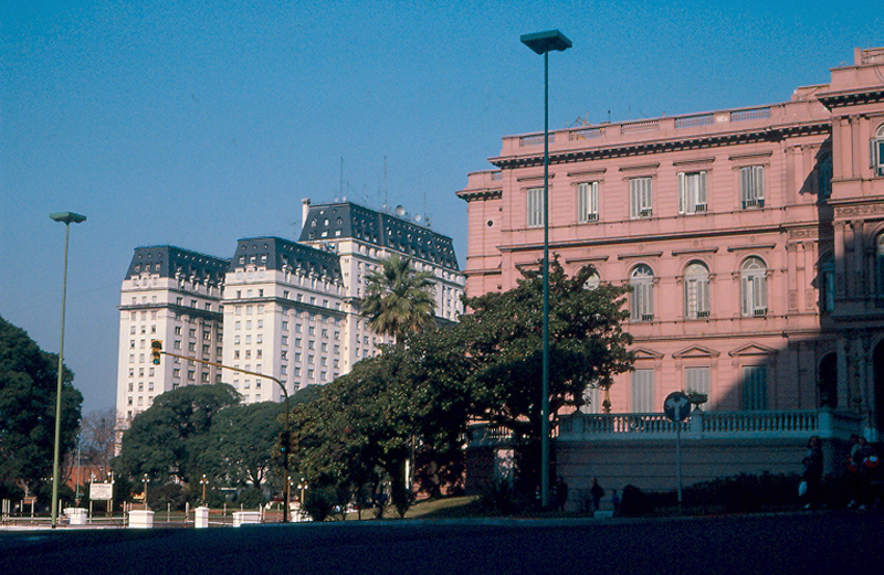 Source: See Buenos Aires Index. Image: From the same place where the previous shot was taken, turning to the right and using a telephoto lens, we see this view. On the right is the famous Casa Rosada, Argentina's version of the White House and Congress. For another view of this building, see: => Buenos Aires #12a. Humanities Language Question: What does casa rosada mean in English? |