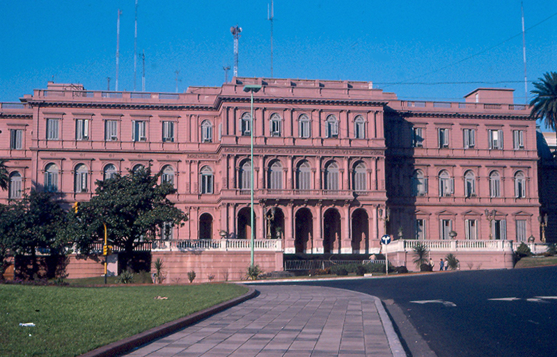 Comments: It is also called the Casa de Gobierno (Government House) and the Palacio Presidencial. It is where most of the executive branch of government is housed. It was built in 1873, and it sits at the east end of the famous Plaza de Mayo. Most of Argentina's major political institutions line this major city square. One explanation for the name comes from the 19th century president, Domingo Faustino Sarmiento (1811-1888; president 1868-1874; author of Facundo), who seems to have chosen the name in order to unite the violently opposed political parties whose emblematic colors were/are red and white. From the central balcony many famous events have occurred: Evita Perón rallied her followers (los descamisados) from there; Pope John Paul II addressed a massive crowd from there in 1998; Madonna sang "Don't Cry for Me, Argentina" from there for her movie Evita (1996).