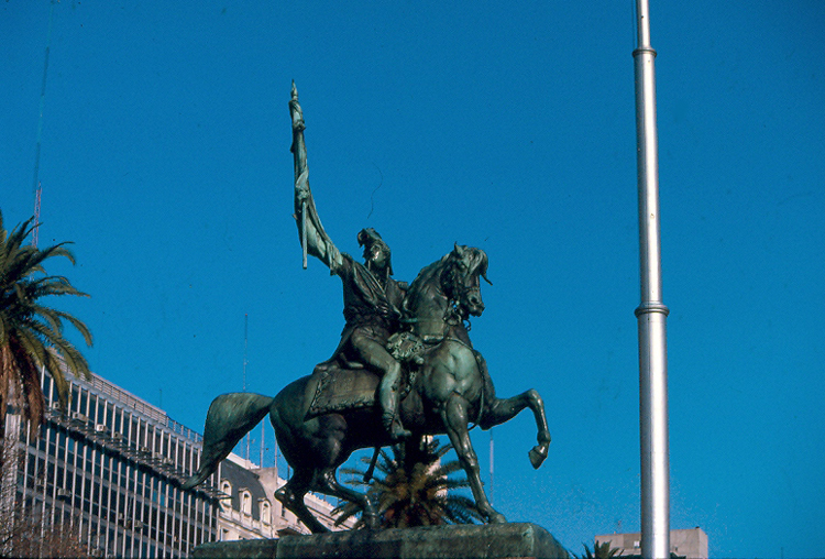Comments: José Francisco de San Martín Matorras (1778-1850) is known as the liberator from Spain of Argentina and the entire southern half of South America. In 1785 he went to Madrid, Spain, to begin his education. There he met Bernardo O'Higgins who would become the hero of Chilean independence. In 1808, he was a Spanish military officer when he fought in the famous Battle of Bailén against the invading French army of José Napoleón. In 1812 he returned to Buenos Aires, where he began fighting in Argentina's War of Independence. Among his major exploits is the extraordinary feat in 1817 of leading his army over the Andes in winter to undertake a surprise attack against the Spanish royalist forces in the famous battles of Chacabuco and Maipú, Chile. In 1821, he and his army captured part of Spain's stronghold of Lima, Perú, and thereupon he was named Protector of Perú. In 1822, in Guayaquil, Ecuador, San Martín held a secret meeting with Simón Bolívar, the liberator of the northern half of South America, the result of which meeting left Bolívar in charge of the united rebel forces. San Martín left Perú, resigned from the army, returned to Buenos Aires, and left South America for good in 1824. He lived the rest of his life in England, Belgium, and France. His remains are now interred in a side chapel in the Cathedral of Buenos Aires (see: => Buenos Aires #17). For close-up photos of this statue see: => Buenos Aires #13a and => #13b.