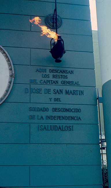Comment #1: In a way it's not fair not showing you, dear online student, a photo of the façade of the Buenos Aires Metropolitan Cathedral, but, between you and me--without meaning at all to demean it (after all it's a church that's beloved in Buenos Aires)--it didn't strike me as being a truly noteworthy building; that is, on the outside; on the inside is another matter, as you will subsequently see. What is really noteworthy on the cathedral's exterior, however, is what you see here. This is Argentina's equivalent of the flame of the unknown soldier in the United States' Arlington Cemetery outside Washington, D.C. Here you see the eternal flame dedicated to "D. (don) José de San Martín and the unknown soldier of independence: salute them!"