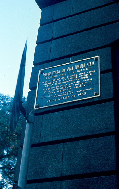 Comment #2 bis: On the corner of the façade of the Metropolitan Cathedral opposite the eternal flame, Argentina has placed this commemorative plaque. It is dedicated to Lt. Col. Don Juan Domingo Perón (1895-1974). It says: "First citizen president of Argentina elected three timnes by the vast majority of the citizenry and standard-bearer for social justice, economic independence, and political sovereignty [erected by] the Friends of Perón Commemorative Commission on January 25, 1985." Perón was a "presidential dictator" from 1943 to 1955, when he went into exile. His wife was the charismatic and famous Eva (Evita) Perón.