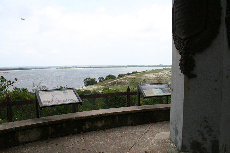 Source: Photo taken by WTL© at Fort Caroline Comments: Stepping back from the edge, now you can see the contemporary relationship between the National Monument's interpretative signs, the column, and the river. The view is toward the northeast. What the contemporary photographer's choice of view is suppressing is a large, modern factory just out of view to the left (northwest). |