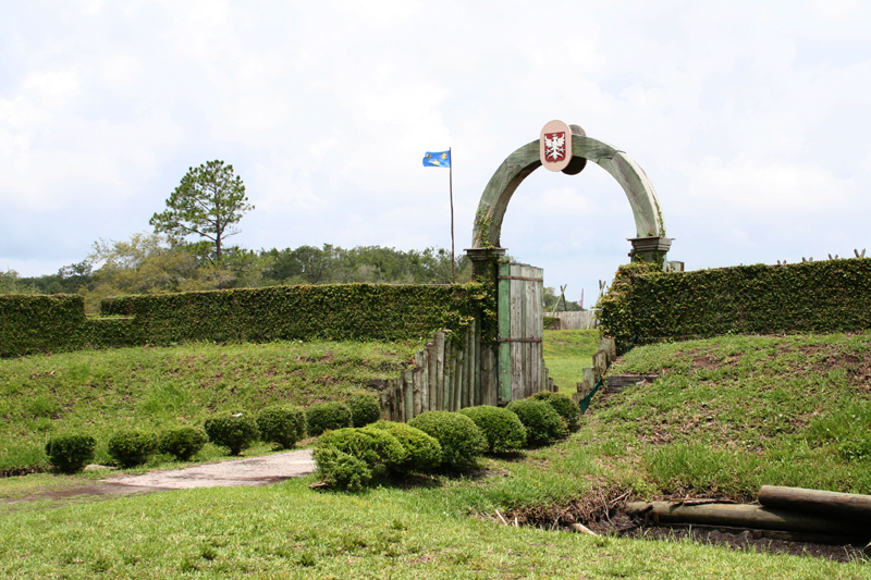 Source: Photo taken by WTL© at Fort Caroline of the entrance to the replica of the fort / settlement itself / themselves. Humanities Questions: (A) What flag is flying over the fort? (B) What crest is affixed to the arch over the entrance? (C) What are the walls made of? (D) What do you imagine you see in the lower right of this photograph? (There's another such item on the other side of the hedge-lined entrance walkway.) |