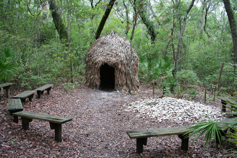 Source and image: Photo taken by WTL© at Fort Caroline of a replica of a native bohio (hut) constructed by the National Park rangers. This hut is alongside the path that leads from the fort to the ranger station and national park museum. (This National Monument is worth the effort to go visit it.) For another reconstruction of a Timucua bohio, home, or building, see: => Fountain of Youth #5 and => Fountain of Youth #6. |