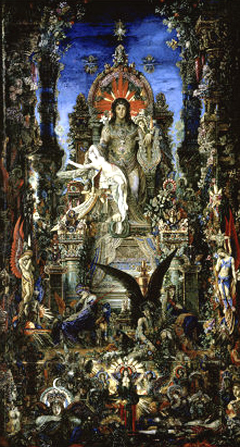 Comments: Here is a view of the full canvas. Moreau was a French painter in the pre-Symbolist and Symbolist movements. He is renowned for his illustrations of biblical and mythological themes and stories. According to the Greek mythology presented by Ovid in his book Metamorphoses, Semele was the illegitimate mother of Dionysus by Zeus, the father of the Greek gods, whose legal wife was Hera. Hera, of course, was angered by Zeus' dalliance with Semele, so Hera tricked Zeus into killing Semele; when she looked at him in all his magnificent glory she was killed by Zeus' tremendous lightening bolts and thunder that radiated from him. Zeus, however, saved Semele's unborn child, Dionysus, by keeping him in his thigh until the baby was born.
