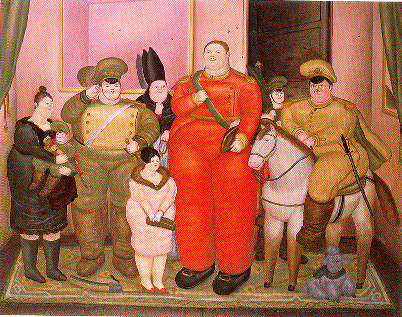 Source: Botero; Paintings and Drawings (New York, 2007), fig. 10. Image: Botero, "Official Portrait of the Military Junta", 1971. Humanities Questions: What are a couple of aspects you see in this painting that may be generally rtelated to Colombian events in the twentieth century, especially a decade before and after the date of this painting (see .mht webpage: => Colombia)? What characters are represented in this canvas and what is the relationship between them? To what great Spanish painting might this painting be compared? What does the difference in size between the characters suggest to you? |