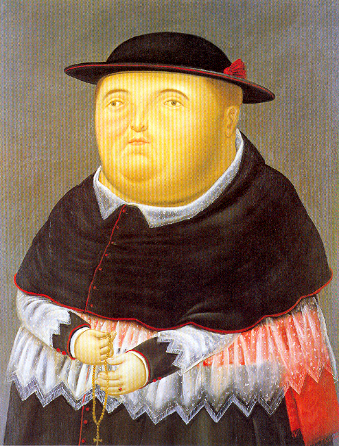 Source: Botero; Paintings and Drawings (New York, 2007), fig. 85. Image: Botero, "Bishop", 1989 (oil on canvas). Humanities questions: Since the title indicates that the artist is depicting a bishop, what aspects of a bishop does he feature? What religion does this bishop supposedly belong to? What is the relationship between this twentieth-century depiction of a Latin American bishop and the bishops we saw earlier in HUM 2461 in the material on Sor Juana Inés de la Cruz? What is the relationship between Botero's painting of a bishop and the portrait of a bishop we saw still earlier in HUM 2461, Bartolomé de Las Casas? |