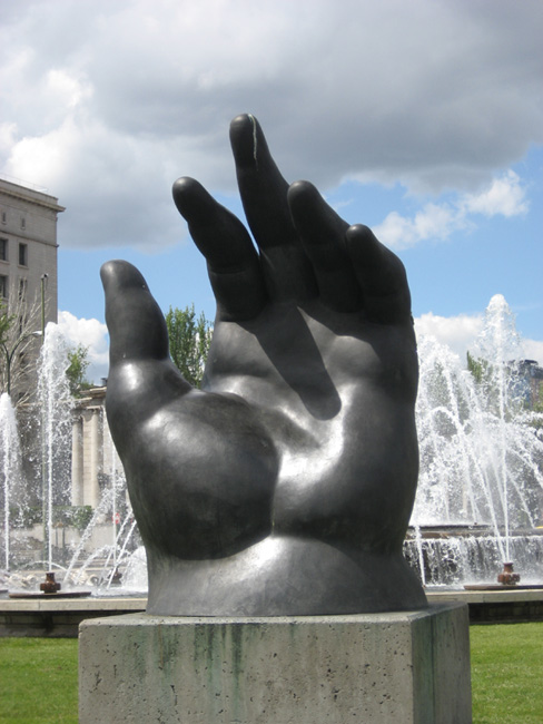 Source: WTL photograph on site in Madrid (2008). Image: Close-up photograph of Botero's sculpture, "Hand" (bronze), in the Plaza de San Juan de la Cruz on the Paseo de la Castellana in downtown Madrid. Comments and questions: The plaza and the fountain you see behind this sculpture is named in honor of the great Renaissance Spanish mystic, saint, and Doctor of the Church, San Juan de la Cruz. (The building behind both the sculpture and the fountain is Spain's Labor Ministry.) Why do you suppost Spain's Ministry of Culture and Madrid's urban planners decided to place this contemporary sculpture squarely in front of this particular fountain/monument? One issue, of course, is that there was already enough space in this traffic circle plaza for such a large sculpture. What other issues, comments, interpretations occur to you given the seemingly stark contrasts between both monuments? |