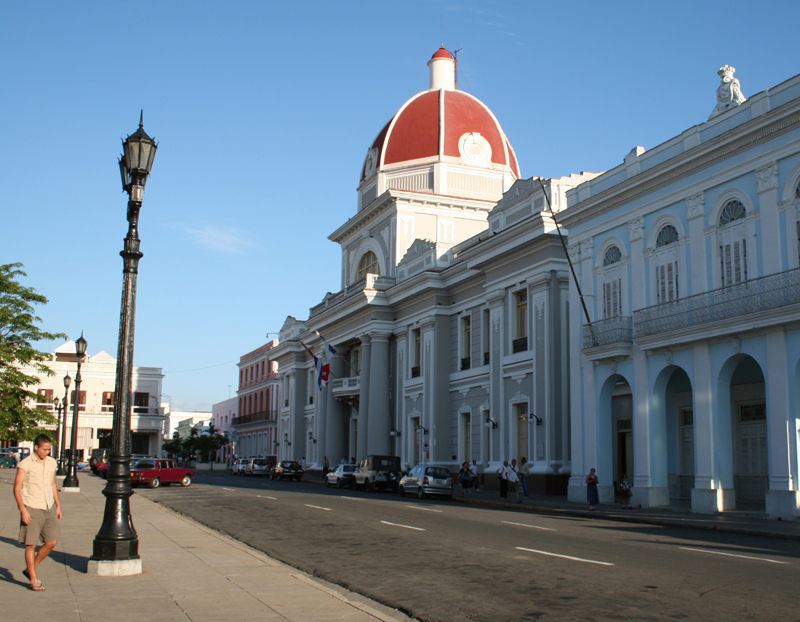 Comments: This image depicts the south side of the city's central plaza, with the municipal building featured. The building's façade is an example of Neoclassical architectural style. In fact, with over 300 extant buildings constructed in the 19th century, Cienfuegos historical center contains the most Neoclassical buildings in the entire Caribbean region. Why so many buildings in this style, which is essentially an 18th-century humanities phenomenon? In terms of a huge generalization, one can say that, ruled by Spanish Bourbon monarchs throughout the 19th century, until independence in 1898, Cuba's official culture was centralized, planned, and conservative, featuring the dominance by the main part of the intelligentsia dedicated to preserving the grandeur of the past. At the same time, of course, new cultural developments such as Romanticism, were being explored by others who were rebelling against the Spanish Ancien Régime. One notable example is José María Heredia.