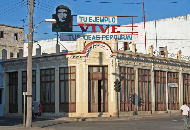 Comments: This building is located on the far NE corner of Cienfuegos's central plaza. Although the architecture shows some nice features, this photo—a humanities artifact, after all—was taken and composed as it is because of the political sign above the building. Next to a picture of Che Guevara with his trademark beret, the sign says (English translation): "Your example is alive. Your ideas are enduring."
