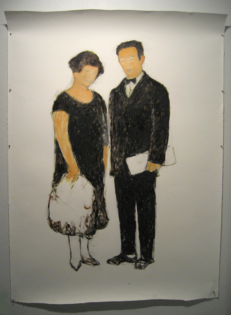 Image: "Grand Parents;" mixed media on paper; 42" x 76". This large work is placed on the east wall immediately to the left of the gallery's entrance door.