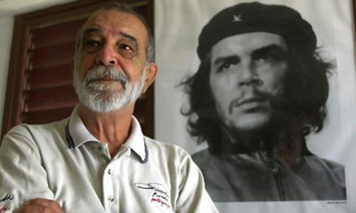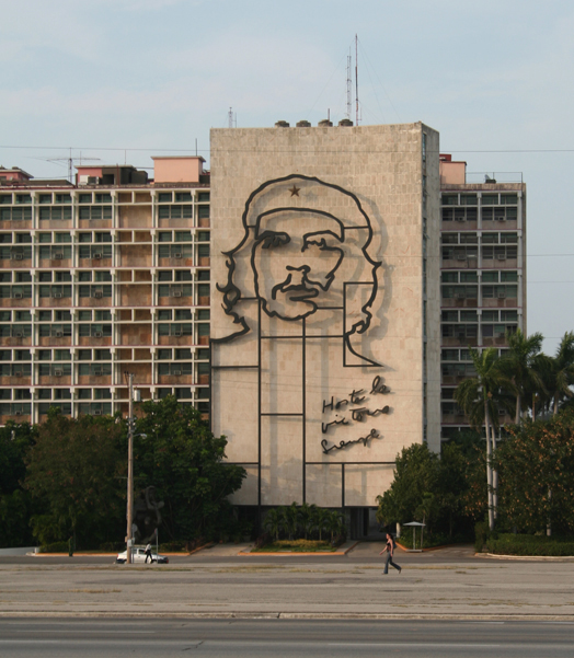 Comments: This building is the Minsiterio del Interior. The effigy is a wire sculpture showing an outline of the famous face of Che Guevara, which in turn is based on the photo of "El Che" taken by Alberto Korda in 1960. (See photo below of photographer and photographed). The words below the face say "Hasta la victoria siempre" (Always onward to victory), a phrase often used by Che Guevara. After Fidel Castro, Che Guevara, and others won the Revolution, Guevara was named Minister of the Interior, and he had an office in this building.