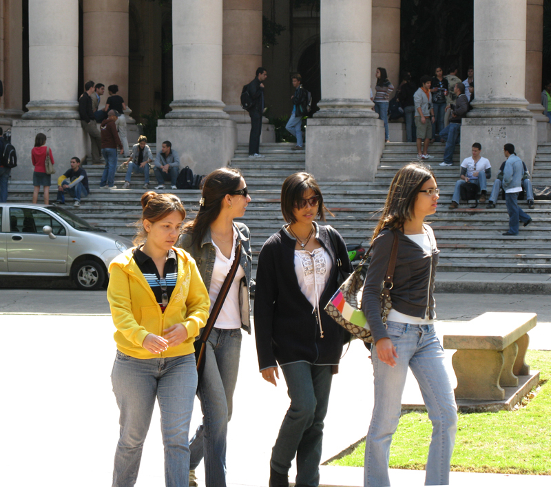 Source: Photograph (2010) by WTL© on site in the quadrangle of the Universidad de La Habana. Comment: Four Cuban students crossing the quadrangle. Humanities topic: Describe what you see in this image.