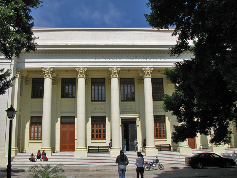 Comments: In keeping with the overall style of the University's core buildings, this building is a fine example of twentieth-century Neoclassical architecture. Ignacio Agramonte y Loynaz (1841-1873) was a wealthy lawyer who was educated in Spain. His a hero of the first Cuban War of Independence (the Ten Years' War of 1868-1878). Agramonte cut a dashing figure, tall, handsome, intelligent, athletic. His beloved wife joined him in the war, but she was captured while pregnant, and she was exiled to the United States. Among his contributions to the war were being elected a provincial representative; signing the first Cuban emancipation proclamantion for Afro-Cuban slaves; drafting the first Cuban constitution; rising to the rank of major general of the cavalry in the revolutionary army (the Spanish troops called him The Young Bolívar"); leading a daring rescue mission to free his commander; and dying a hero's death in a battle in 1873. Máximo Gómez succeeded Agramonte as principal miliary commander from the Camagüey region. (For a significant reference to Máximo Gómez in Little Havana among the Cuban community in Miami, see: => Calle Ocho #6.)